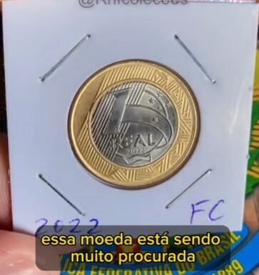 O item que você vai conferir a seguir, por exemplo, se encaixa na terceira opção. Segundo o TikTok RNF Coleções, esta moeda de 1 real feita em 2022 pode chegar em até R$ 200 devido ao seu erro.
