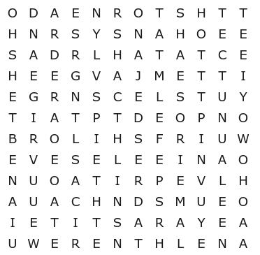 A seguir, veremos se é capaz de localizar a palavra “torneado” no caça-palavras em apenas alguns segundos. Observe bem no quadro abaixo: