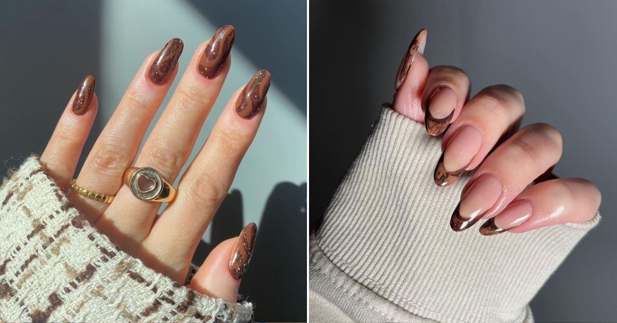 Em seguida, desenhe linhas fluídas, mas precisas, num tom de marrom mais claro. Ao final, você terá uma manicure semelhante a um café cremoso. O estilo ficará melhor em unhas de ponta arredondadas.