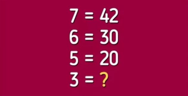 O portal britânica The Mirror realizou uma proposta que deixou os internautas intrigados, a fim de tentar descobrir qual seria o próximo número de uma sequência proposta. A figura revela certo padrão, mostrando 7 = 42, 6 = 30 e 5 = 20. Haja vista a continuação dos resultados, poderia dizer o que se iguala ao número 3?