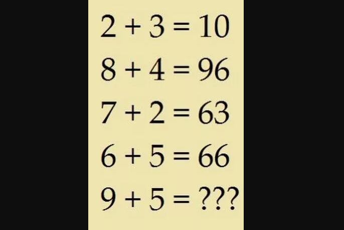 A questão é a seguinte na imagem: 2+3 = 10, 8+4 = 96, 7+2 = 63, 6+5 = 66. Será necessário descobrir a resposta de 9+5, mas não se trata de uma soma direta.