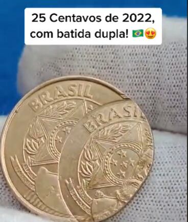 A moeda que você confere a seguir, por exemplo, faz parte deste terceiro grupo. O item no valor de 25 centavos foi cunhado em 2022 e, segundo o TikTok ‘Numismática JF’, pode render até R$ 1 mil ao proprietário, caso ela apresente o defeito ‘batida dupla’, que consiste na moeda ser cunhada duas vezes.
