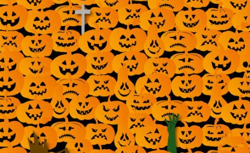 A proposta consiste no seguinte: Na figura, existem diversas abóboras, sendo necessário encontrar uma caveira dentre elas 10 segundos. O teste não é tão simples quanto parece. Observe bem a imagem abaixo: