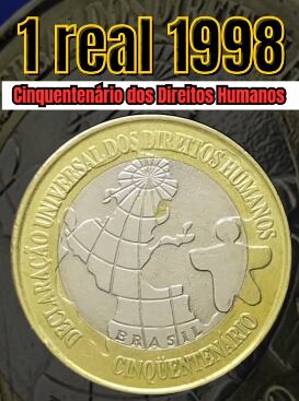 A moeda a seguir, por exemplo, na quantia de 1 real é feita em comemoração ao Cinquentenário da Declaração Universal dos Direitos Humanos, em 1998. Segundo um TikTok especializado em moedas raras e valiosas, foram feitas apenas 600 mil unidades deste modelo que, segundo o catálogo de moedas brasileiras, vale R$ 750 em estado de conservação flor de cunho, ou seja, sem nenhuma marca de uso.