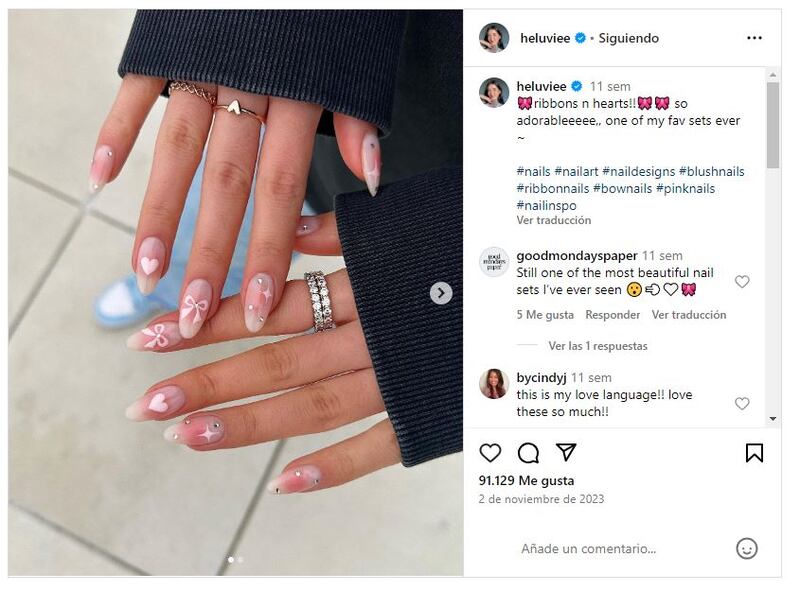 As unhas coradas não são novas, mas combinam bem com a estética coquete devido ao seu ar romântico. Se quiser experimentá-las, aposte nesta versão com laços, corações e brilhos que a elevam.