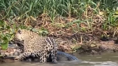 Um novo vídeo incrível flagrou uma luta selvagem entre uma onça e um jacaré gigante em um rio com direito a um giro mortal.