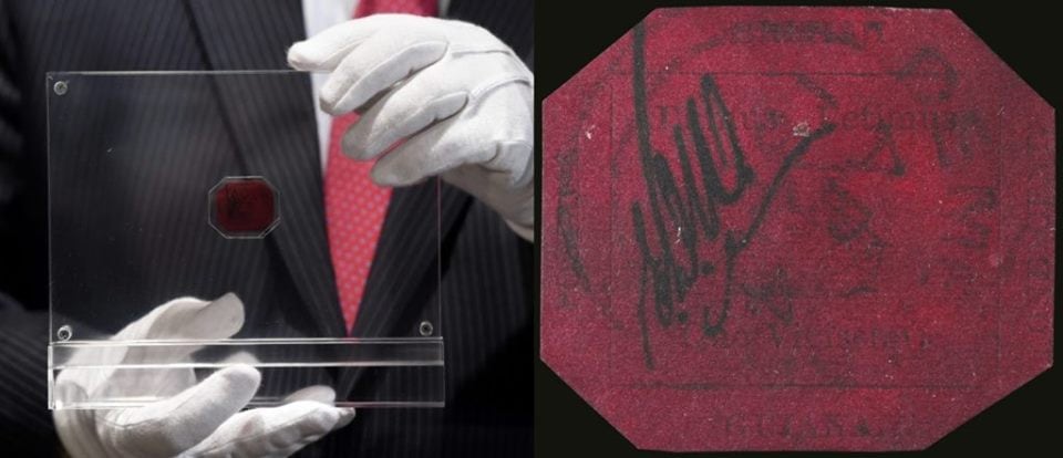O pequeno selo com um carimbo postal e o desenho de um navio de três mastros foi leiloado por R$ 9,5 milhões em Nova York, após ficar exposto na casa de leilões Sotheby’s, em Londres.