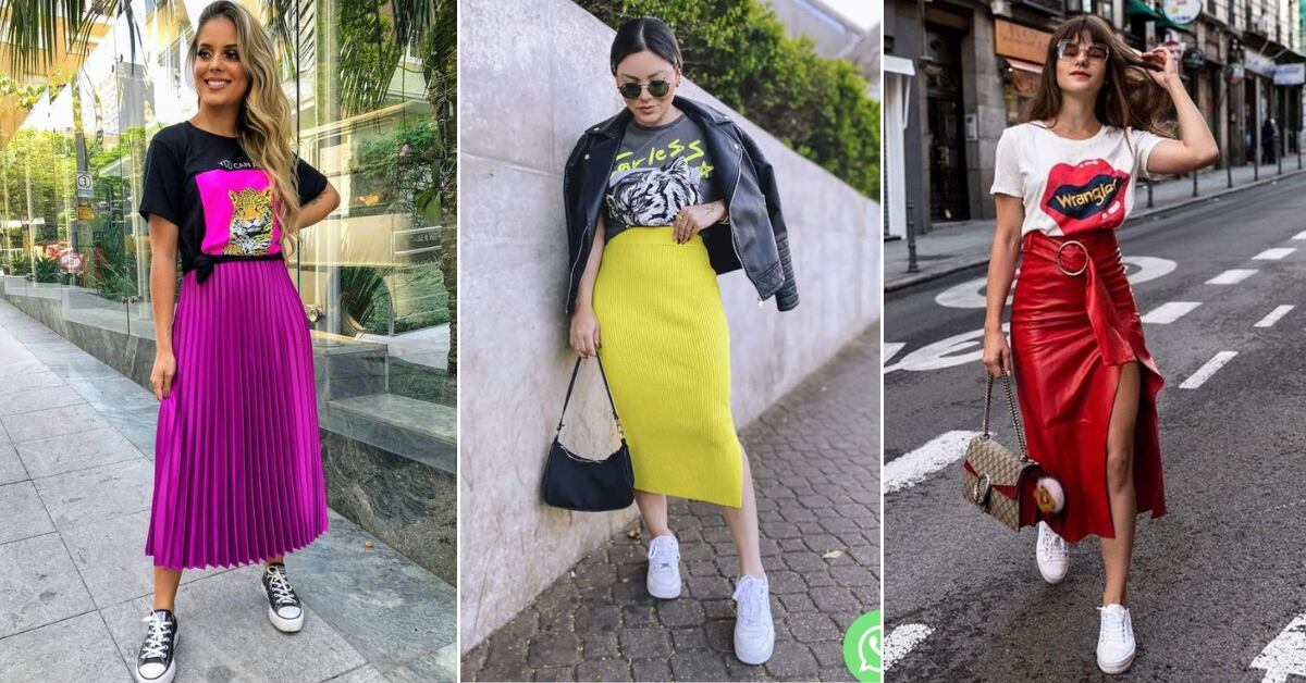 Mas desta vez o complemento destas divertidas camisetas não serão as calças jeans, mas sim outra peça que consegue elevar o seu potencial, criando looks não só confortáveis, mas também glamorosos que certamente irá querer usar em diferentes ocasiões, o melhor é que é possível que já tenha todos os elementos, então vista-se incrivelmente enquanto impressiona com o seu visual.