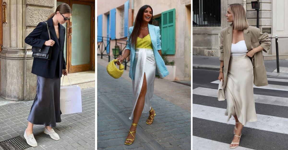 Embora haja milhares de maneiras de combiná-las, seja com jaquetas de couro estilo biker, tops relaxados ou até mesmo moletons, para conseguir um look sofisticado, você só precisa ter em mente duas coisas: blazer e saias de cetim.