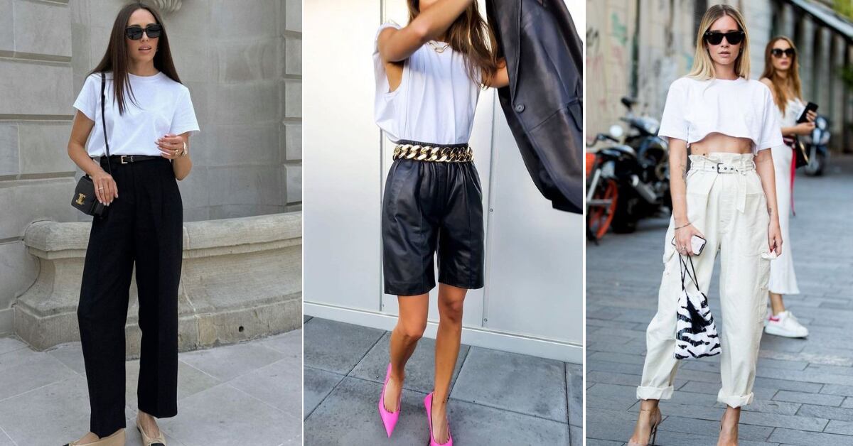 As camisetas brancas ficam ótimas com calças de cintura alta, seja em formato palazzo ou mesmo culotte, são perfeitas juntas e se adicionar um cinto grosso irá realçar o seu visual, o toque elegante vem nos sapatos e acessórios, seja usando óculos de sol, uma bolsa pequena ou clutch e saltos altos.