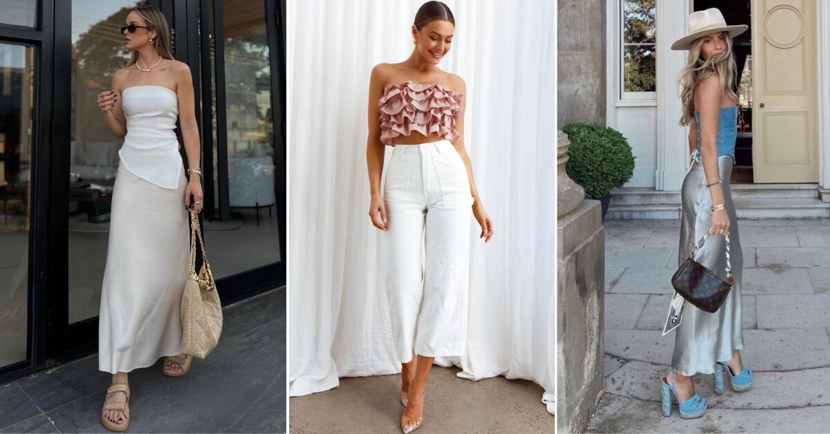 Se estiver procurando por algo mais descontraído, opte por um top ‘bandeau’ jeans com umas calças largas ou cargos, adicione um toque chique com um par de sandálias de salto e óculos de sol.