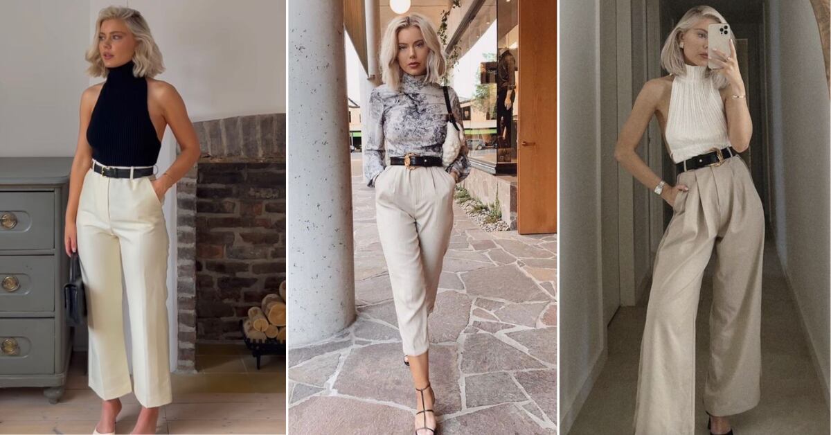 A calça de alfaiataria estará em alta dê um toque com uma blusa gola alta e sandálias de salto, você parecerá uma especialista em moda.