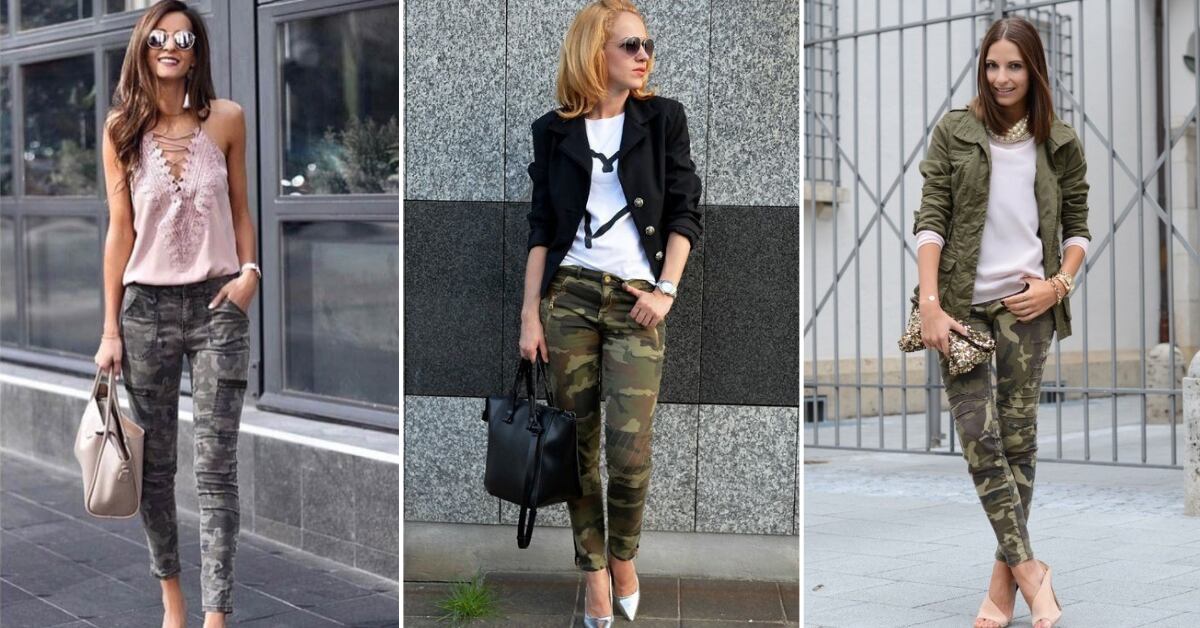 Se quiser um look chique e sensual, combine umas calças cargo com estampa militar ou camuflada, juntamente com sandálias de salto alto e um body justo ao corpo, neste caso, um com recortes, e complemente com uma jaqueta estilo motociclista de cor semelhante.