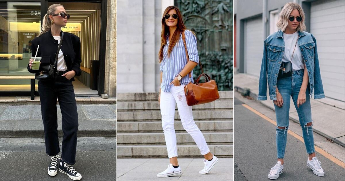 Entre as considerações que você deve levar em conta ao combinar tênis Converse com jeans está o uso das calças. Para parecer moderno, use este calçado com a tendência do momento, seja wide leg, cargo, baggy, skinny ou mom.