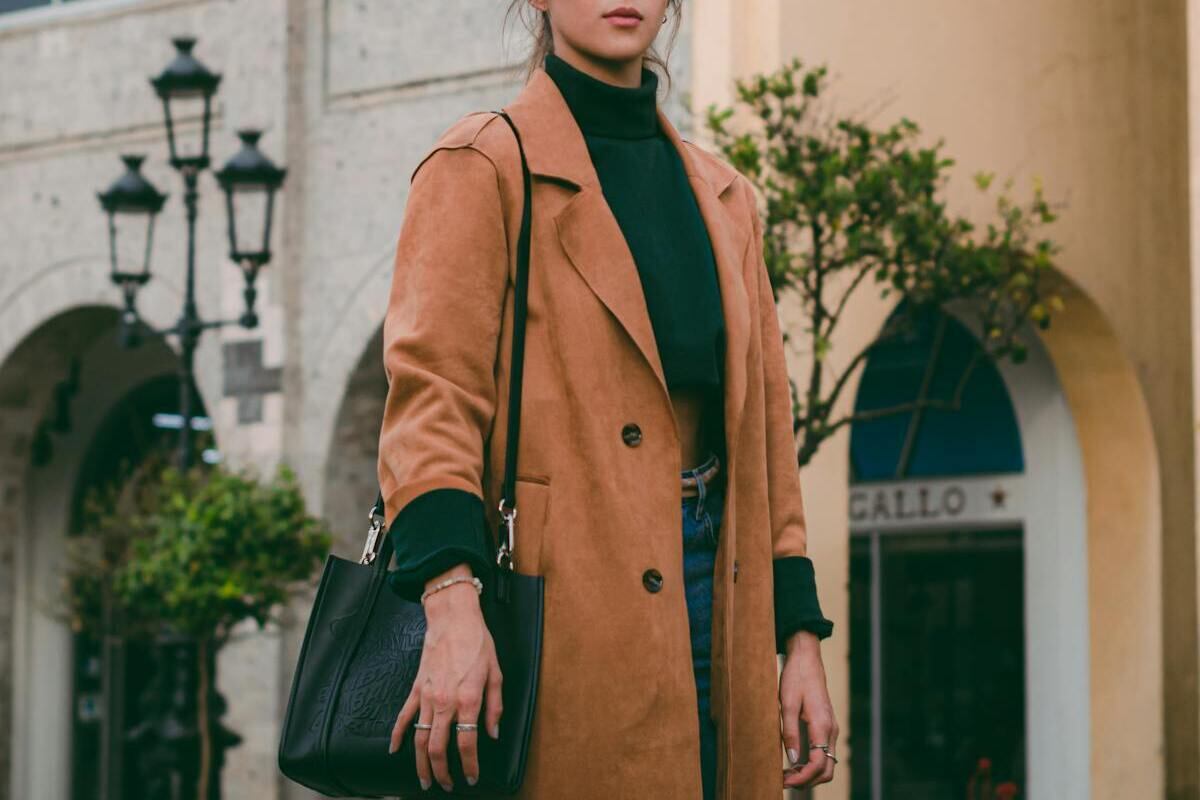 Um trench coat ou um casaco leve também é outra boa opção para complementar o seu visual com coletes de gola alta em dias frios.