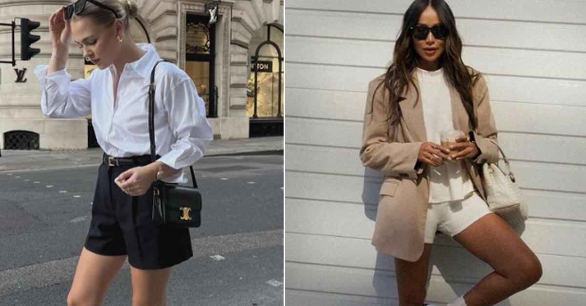 Outra roupa super elegante e moderna para usar em 2024, até mesmo para o trabalho, é um short de alfaiataria com uma camiseta branca e um blazer.