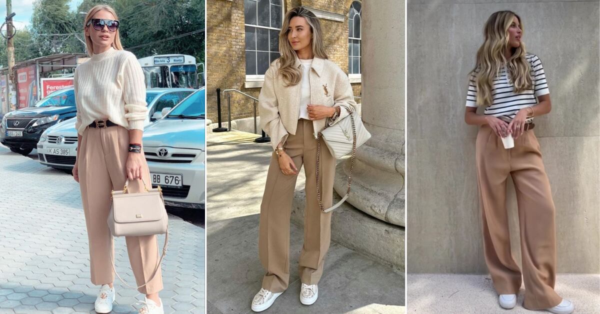 Os tênis brancos são básicos no guarda-roupa, mas se você está procurando dar um toque moderno e sofisticado, então combine-os com calças bege para obter um dos looks mais chiques em pouco tempo.