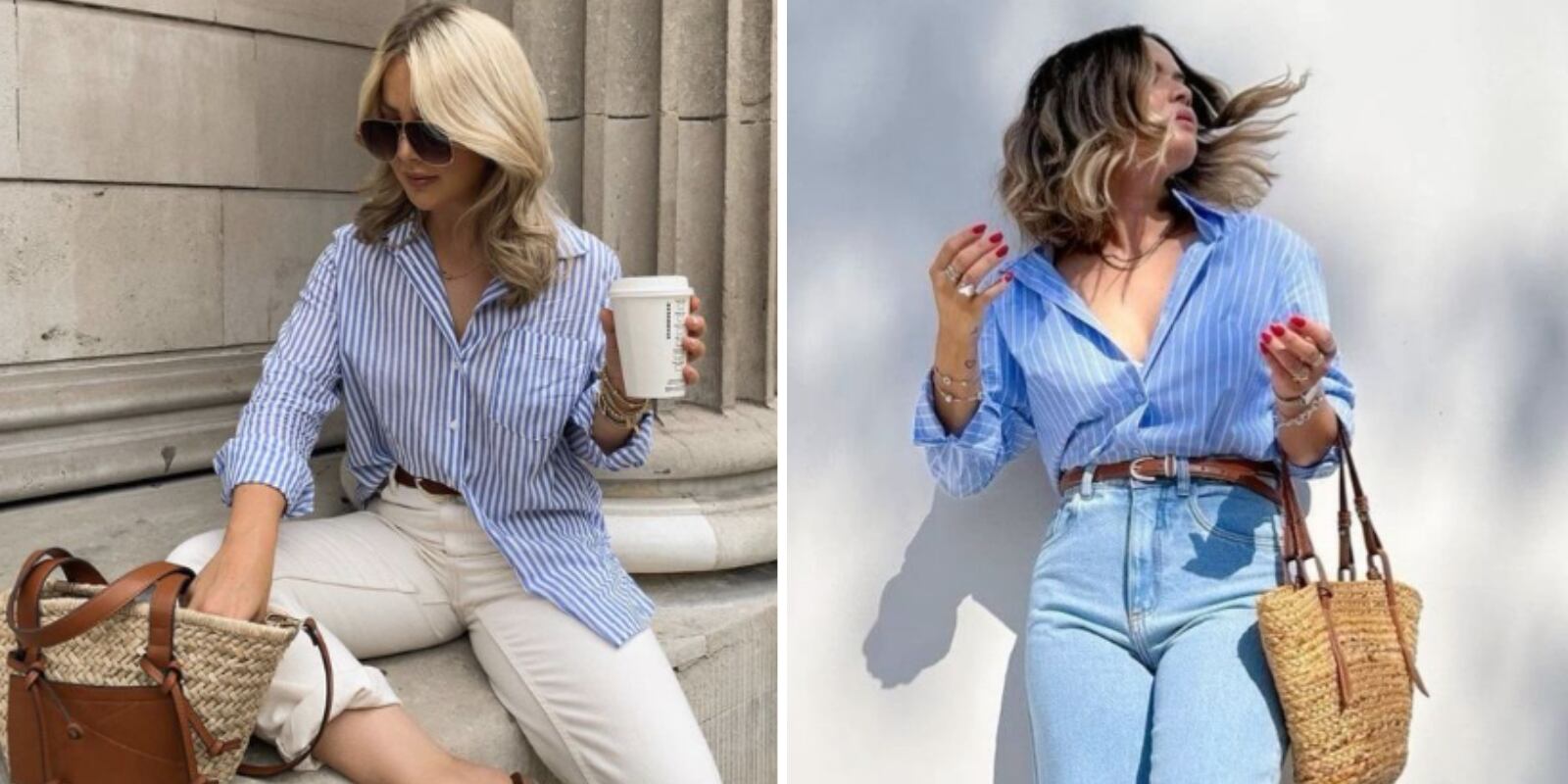 Outra maneira moderna e fresca de usar uma camisa listrada é amarrando-a na cintura. Isso não apenas adiciona um elemento divertido ao seu visual, mas também é útil para definir a silhueta. Você pode usar uma camiseta básica preta ou branca e, por cima dela, amarrar sua camisa listrada.