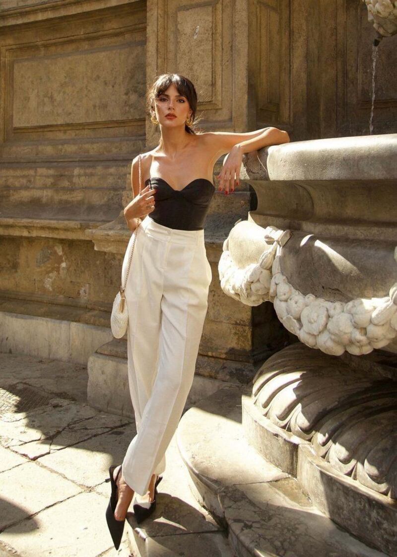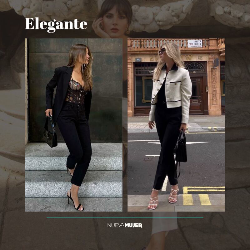 Aqui estão duas versões do uso de calças cigarrete em sua versão elegante e glamourosa, que são perfeitas para um encontro ou saída noturna. Na primeira opção, elas são combinadas com um corpete de renda, blazer e sandálias de salto alto. Por outro lado, se você está procurando algo mais suave, então um casaco de tweed curto combinado com um look total preto e sandálias de salto alto que contrastem, são a opção.