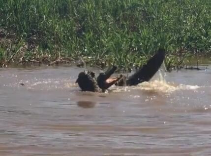 No registro viral, é possível ver o enfrentamento selvagem onde o jacaré tenta resistir ao ataque.