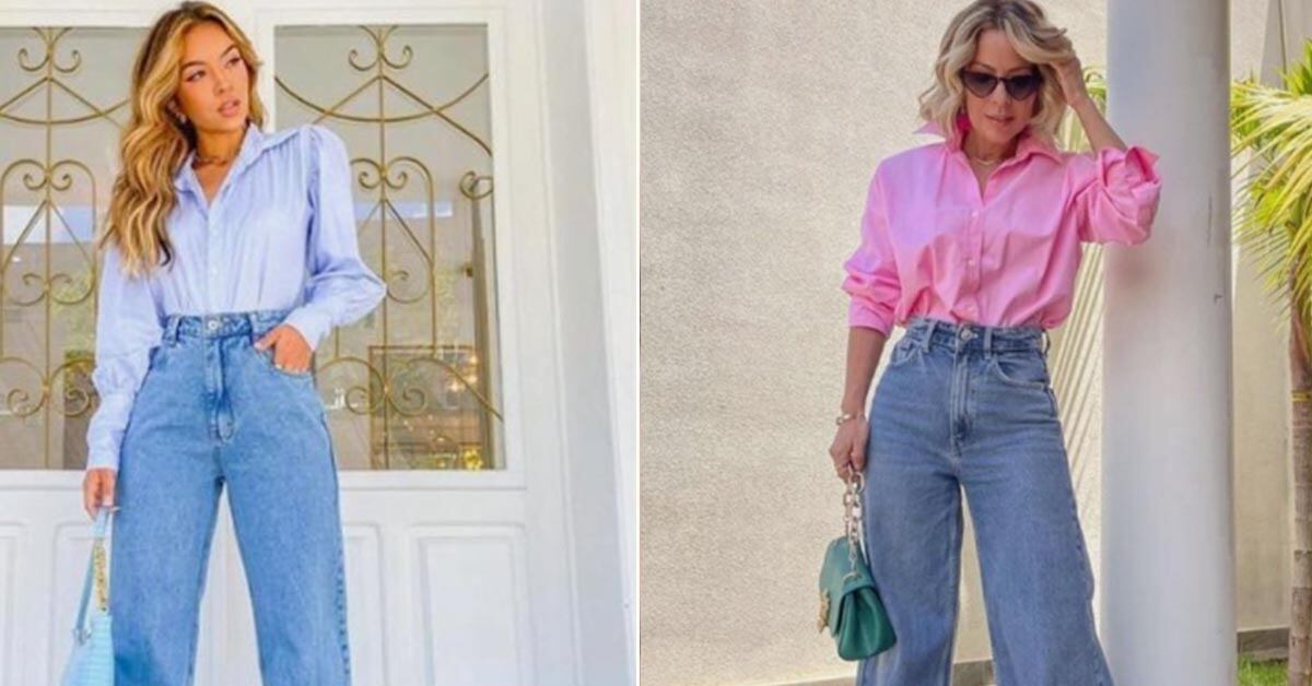 Como combinar jeans wide leg com uma camisa colorida para parecer elegante e estilosa aos 40 anos