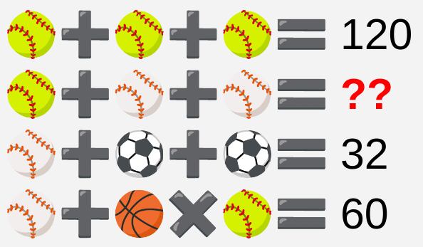 Observe: a imagem conta com diversos elementos, contendo algumas bolas representando números misteriosos. No entanto, os resultados dos primeiros problemas te conduzirão a descobrir o restante, fazendo associação com os emojis e resultados.