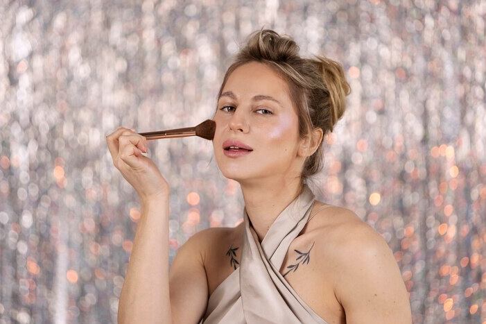 1. Preparação da pele - Comece com a preparação da pele, hidratando bem, em seguida aplique um primer para garantir fixação e uniformidade. Escolha uma base leve com acabamento luminoso, que realce o viço natural da pele, e um corretivo para corrigir pequenas imperfeições. Finalize com um pó translúcido apenas na zona T para manter um brilho controlado.