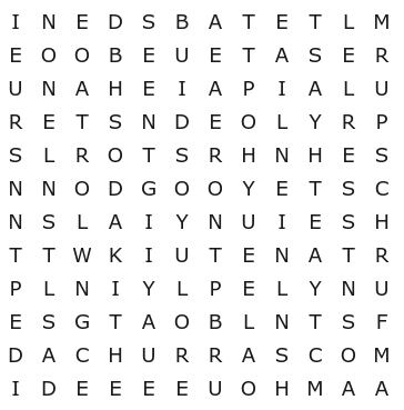Está pronto para mostrar sua perícia? Tente localizar a palavra “CHURRASCO” no quadro abaixo. Mas atenção: o tempo é curto — você tem apenas 12 segundos para completar o desafio. Este exercício vai temperar sua percepção com a mesma maestria que o churrasco deixa qualquer ceia especial.