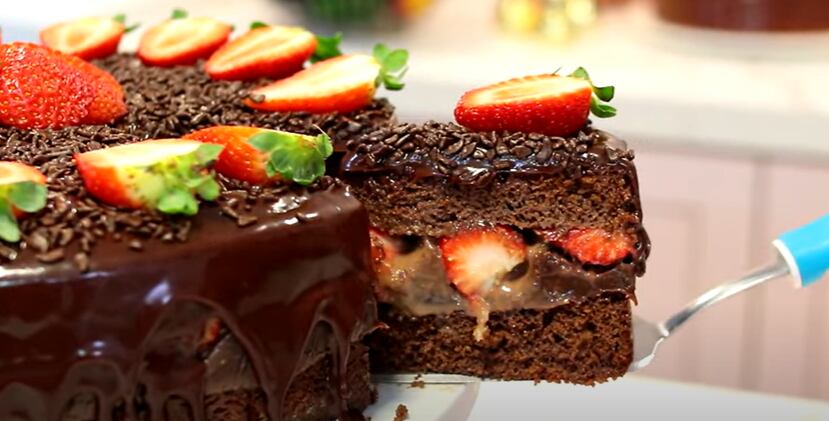 Confira uma nova receita de bolo de chocolate com recheio de brigadeiro e cobertura de morango para fazer em poucos passos. A preparação foi compartilhada recentemente no YouTube pelo canal Receitas da Cris.