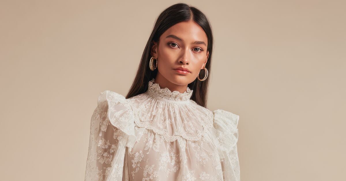 Uma versão ousada da tendência que combina o vintage com o contemporâneo. A blusa branca com detalhes em renda e gola redonda se transforma quando combinada com uma saia lápis midi de couro preta, ou você pode criar um look estampado da cabeça aos pés. Adicione botas de salto alto e uma bolsa estruturada para alcançar um equilíbrio entre inocência e poder. O contraste entre o suave e o forte é a nova definição de elegância moderna.