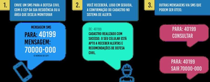 A Defesa Civil Nacional, subordinada ao Ministério do Desenvolvimento Regional (MDR), criou um sistema de alerta que funciona via SMS – as mensagens de texto que recebemos por celular que não necessitam de conexão à internet – que é acionado sempre que há possibilidade de desastre.