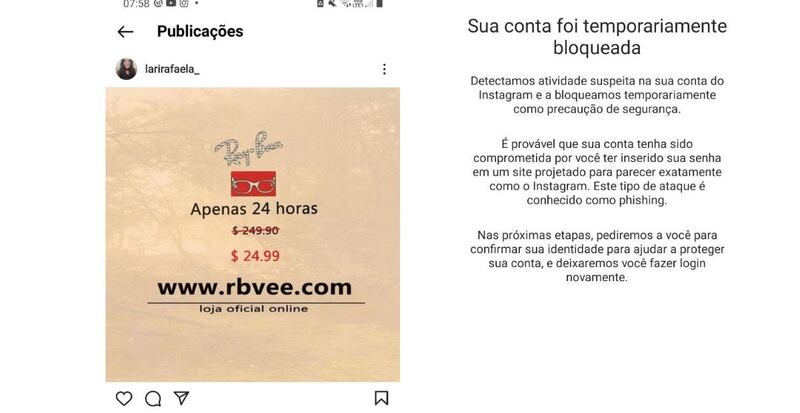 No entanto, mesmo após seguir os procedimentos, Larissa afirma que recebeu uma mensagem do próprio Instagram dizendo que foi constatada uma ação suspeita no perfil e que o mesmo tinha sido bloqueado. O texto ainda dizia que ela foi vítima de “phishing”, que é quando os criminosos usam algum tipo de truque para enganar as vítimas e obter as informações confidenciais. De posse desses dados, eles conseguem acesso ao perfil.
