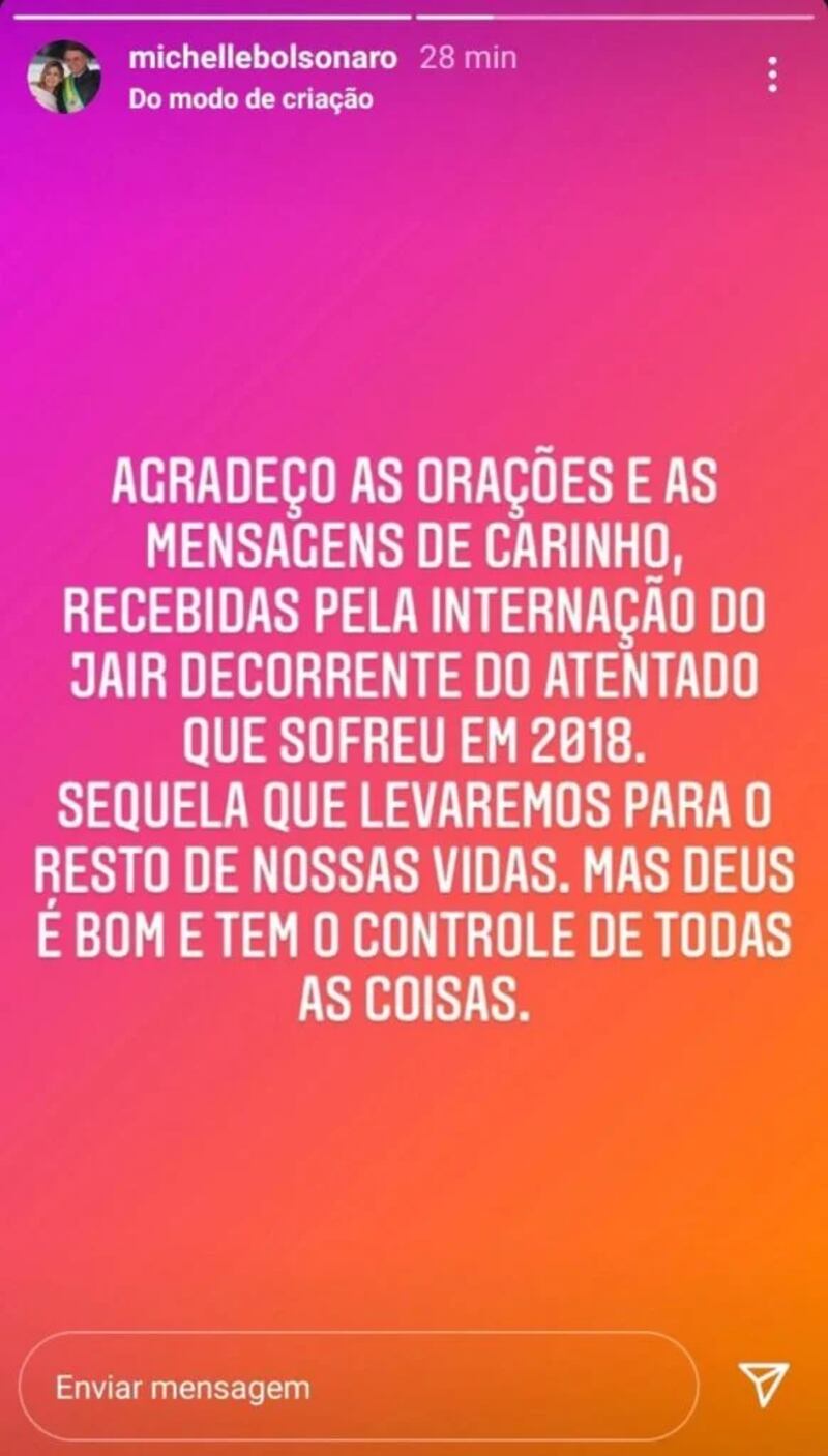 A primeira-dama Michelle Bolsonaro falou nesta segunda-feira (3) sobre a saúde do presidente Jair Bolsonaro, que está internado no Hospital Vila Nova Star, em São Paulo. Em postagem nas redes sociais, ela agradeceu as mensagens de apoio recebidas e destacou que a internação é resultado da facada sofrida pelo marido em 2018.