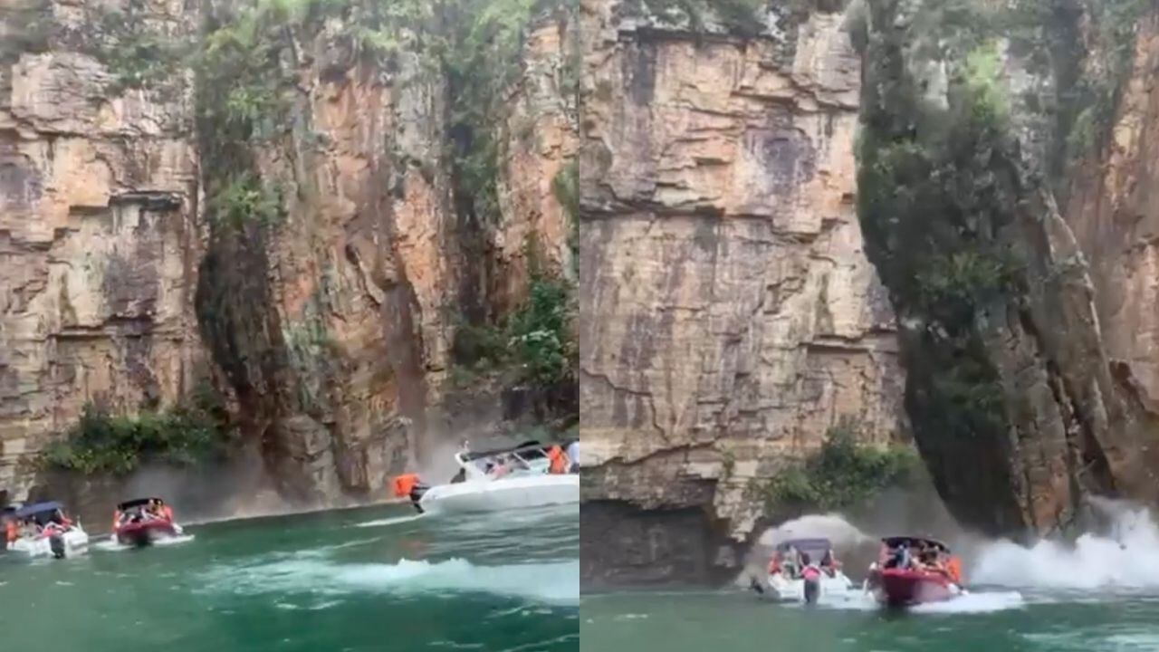 De acordo com as imagens, vários barcos de passageiro passeavam pelo lago e três deles estavam mais perto da cachoeira. Em determinado momento, um paredão de pedra e terra se solta do enorme barranco e atinge os barcos com violência.