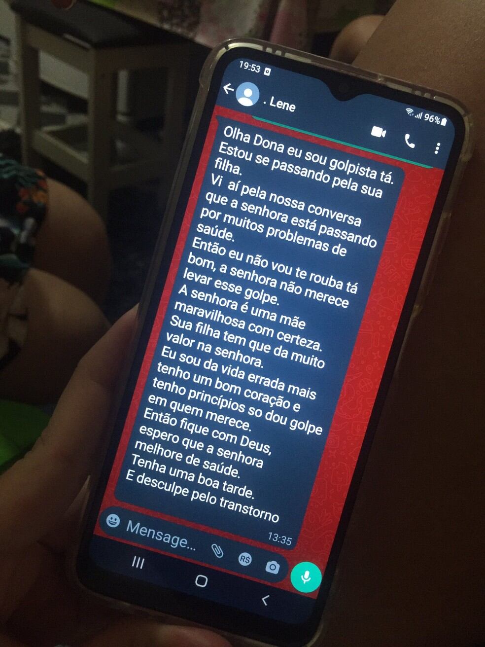 “Olha, Dona. Eu sou golpista, tá. Estou me passando pela sua filha. Vi aí pela nossa conversa que a senhora está passando por muitos problemas de saúde. Então eu não vou te roubar, tá bom? A senhora não merece levar esse golpe. A senhora é uma mãe maravilhosa, com certeza. Sua filha tem que dar muito valor para a senhora. Eu sou da vida errada, mas tenho um bom coração e tenho princípios. Só dou golpe em quem merece. Então fique com Deus, espero que a senhora melhore de saúde. Tenha uma boa tarde e desculpe pelo transtorno”, respondeu o criminoso.