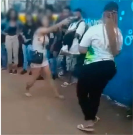O incidente aconteceu nesta terça-feira, quando duas jovens se desentenderam na saída da escola, com vários alunos assistindo. Em dado momento, uma das jovens abre a bolsa e tira um revólver de dentro, apontando para a cabeça da outra. Intimidada, a estudante recua e a outra guarda a arma na bolsa novamente.