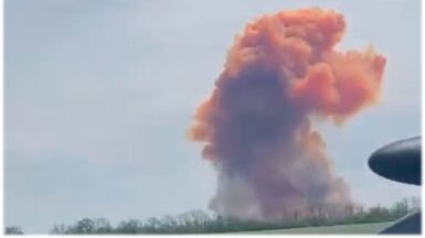 Um vídeo compartilhado nas redes sociais mostra o momento em que a nuvem alaranjada sobe ao céu na cidade de Sloviansk, no leste da Ucrânia, onde um bombardeio russo causou vazamento em uma fábrica de nitrato de amônia, nesta quarta-feira.