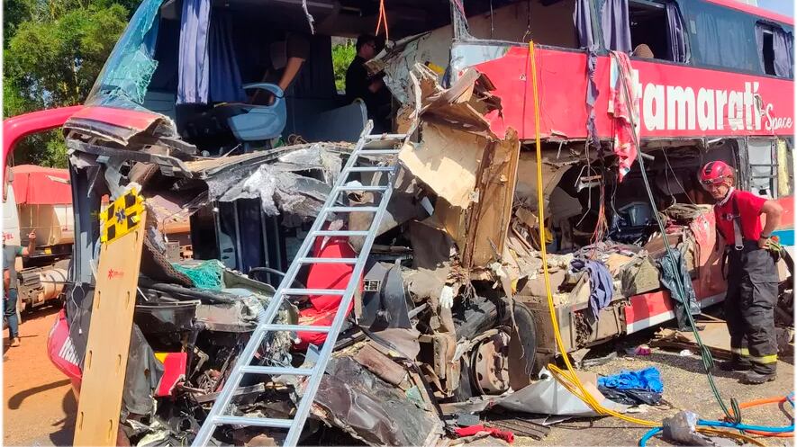 O choque foi tão forte que praticamente destruiu toda a frente e a lateral do ônibus, que transportava 45 passageiros. O motorista ficou preso às ferragens e teve o braço amputado na colisão. Ele foi socorrido em estado grave. De acordo com a Polícia Rodoviária Federal (PRF), há outras vítimas que também foram socorridas em estado grave.