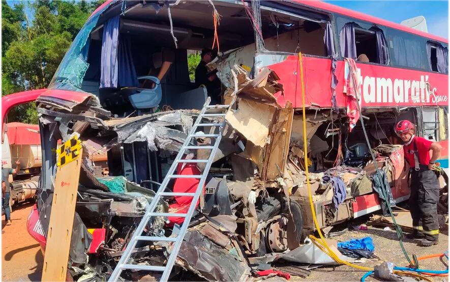 O choque foi tão forte que praticamente destruiu toda a frente e a lateral do ônibus, que transportava 45 passageiros. O motorista ficou preso às ferragens e teve o braço amputado na colisão. Ele foi socorrido em estado grave. De acordo com a Polícia Rodoviária Federal (PRF), há outras vítimas que também foram socorridas em estado grave.