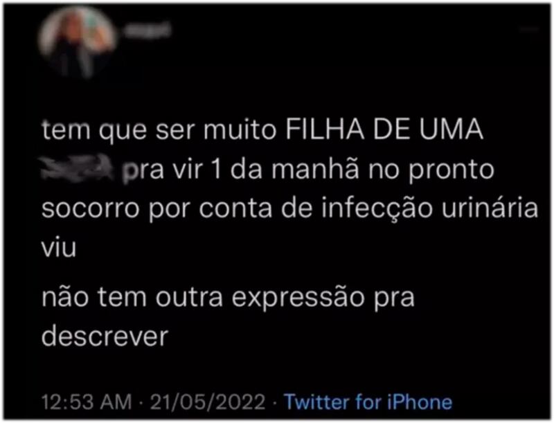 Em sua postagem no Twitter a médica Mariana da Lima Alves diz: “Tem que ser muito FILHA DE UMA **** pra vir 1 da manhã no pronto socorro por conta de infecção urinária viu. Não tem outra expressão pra descrever.”
