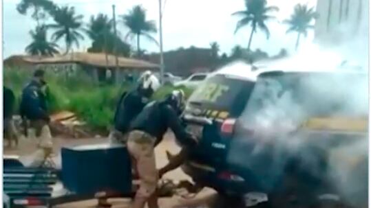 Um vídeo que vazou nas redes sociais mostrou o momento exato em que um dos policiais rodoviários federais que estão tentando colocar Genivaldo de Jesus Santos no porta-malas da viatura destrava e joga uma bomba de gás no veículo.
