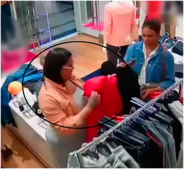 O furto ocorreu na loja Hilfiger, no Praiamar Shopping, por volta das 20h. Pelas imagens, é possível ver a mulher acompanhada de uma comparsa olhando os itens da loja. A comparsa pede para ver um sapato que está na vitrine e enquanto a atendente se ausenta para buscar o item, a ladra enrola a jaqueta, levanta a saia, que era um modelo comprido, até os pés, e enfia a jaqueta enrolada no meio das coxas.
