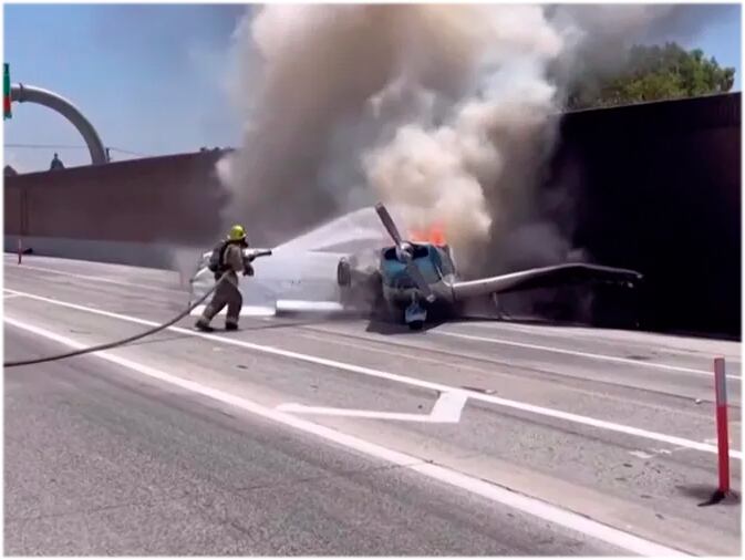 Um avião monomotor de pequeno porte fez um pouso forçado em uma rodovia da Califórnia, nos Estados Unidos, nesta terça-feira, se chocou contra a pista e acabou pegando fogo.