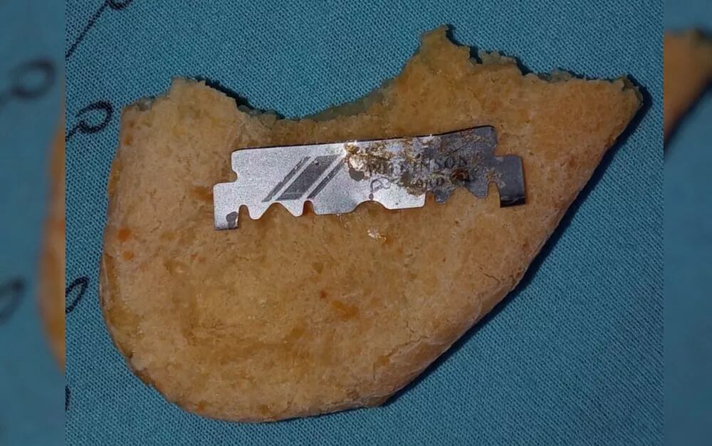 A dona de casa Solange Dias teve uma surpresa nada agradável ao comer um simples pão de queijo, em Anápolis, Goiás. A mulher denunciou que, ao morder o petisco, sentiu algo duro e, ao prestar atenção, encontrou uma lâmina no recheio. Ela chegou a dividir o lanche com a filha, de 2 anos, mas por sorte elas não ficaram feridas.