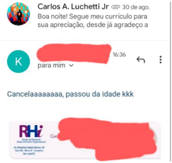 Mas no e-mail de resposta enviado a Carlos Augusto Luchetti Junior, de 45 anos, a recrutadora se limitou a escrever como resposta: “Cancelaaaaaaaa, passou da idade”. A vaga, segundo Luchetti, era para auxiliar de estoque.