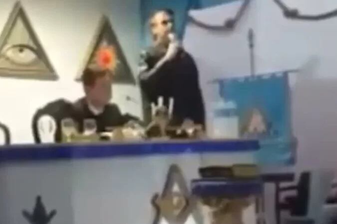Nas imagens, o presidente aparece discursando em uma espécie de altar adornado com símbolos tradicionais da Maçonaria, como o esquadro e o compasso.