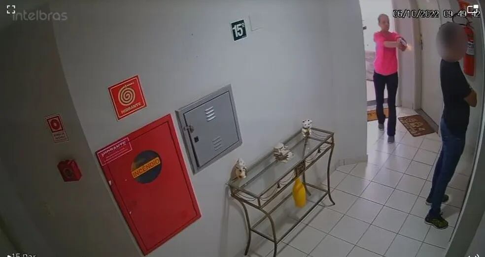 O crime foi cometido do lado de fora do apartamento, entre a porta e o elevador. Nas gravações, é possível ver o homem fechando a porta e saindo do apartamento em direção ao elevador. A mulher então abre a porta, aponta a arma para as costas dele e atira.