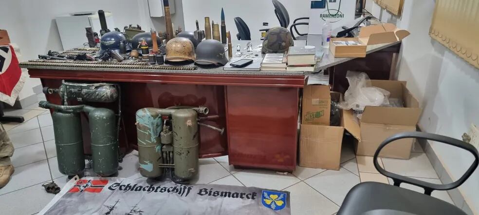 Foram apreendidos uma arma de fogo calibre 38, duas munições de mesmo calibre, 111 munições de calibre 762 com a suástica gravada no fundo, munições de metralhadora .50, granadas, dois lança-chamas, além de bandeiras nazistas, broches e outros materiais gravados com a suástica.