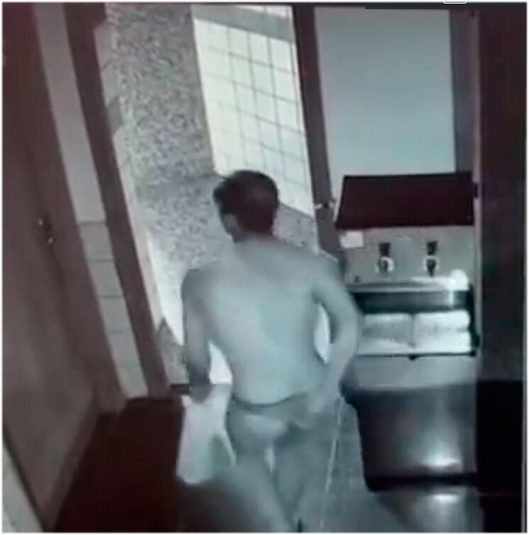 Nas imagens fornecidas pela polícia, ele aparece saindo do banheiro com uma sacola cheia de torneiras e sai pela cozinha. Ele está praticamente nu, vestindo apenas a calcinha, e descalço.