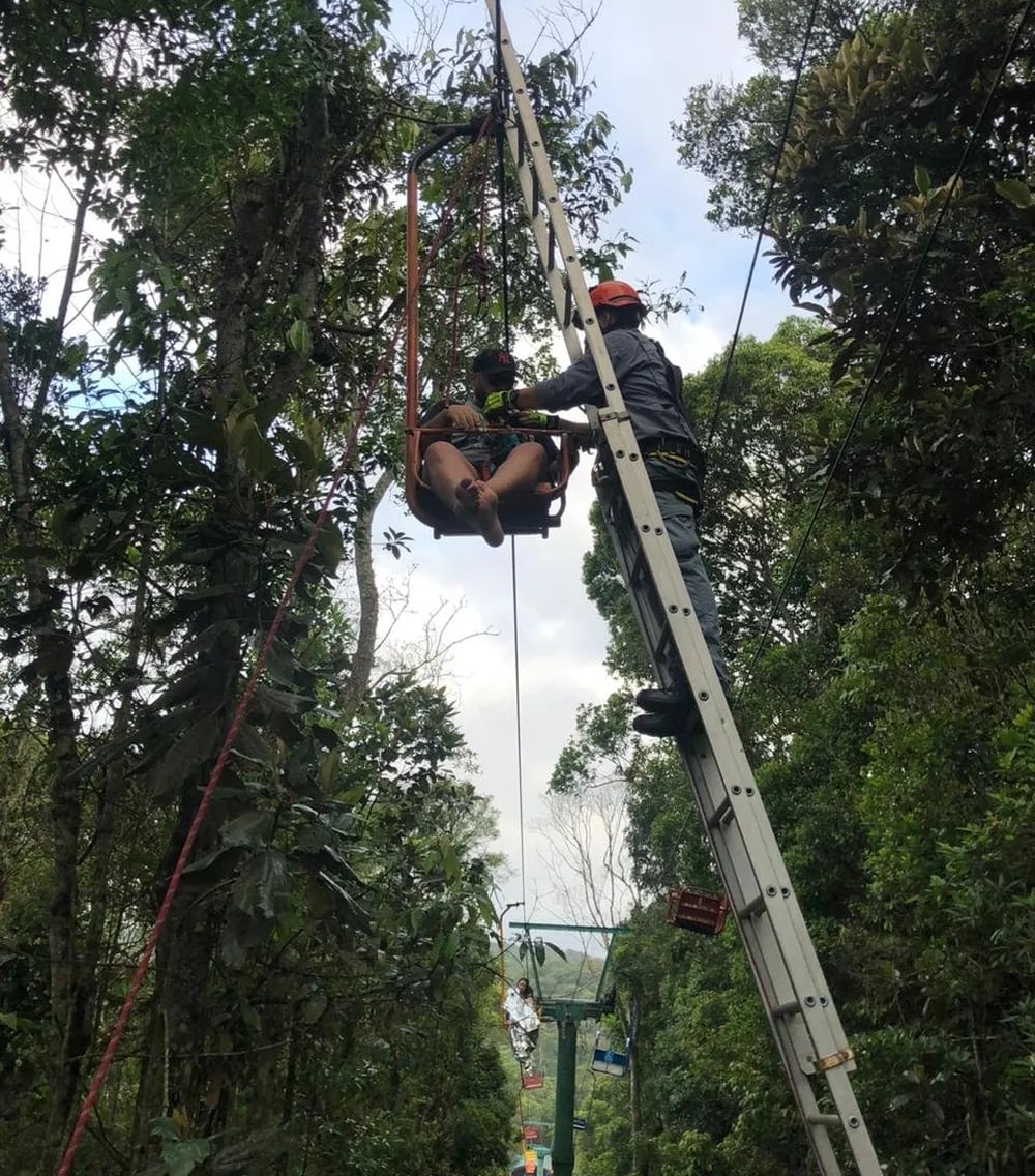 Um vídeo divulgado pelos bombeiros nas redes sociais mostra o momento do resgate (veja abaixo). Eles precisaram usar escadas, cordas e equipamentos de rapel para tirar as pessoas uma a uma do equipamento.